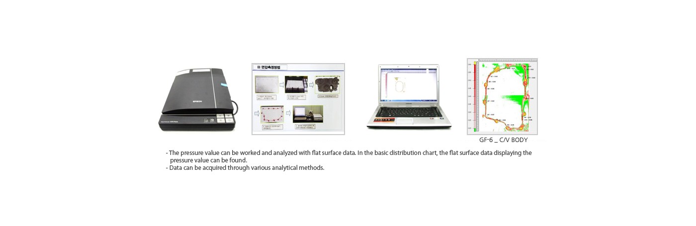 - 본 시험기는 압력분포 맵핑시스템 장비로 프리스케일의 측정데이터를 수치데이터로 전환하거나 데이터로 저장하고 데이터분석을 할수있다.